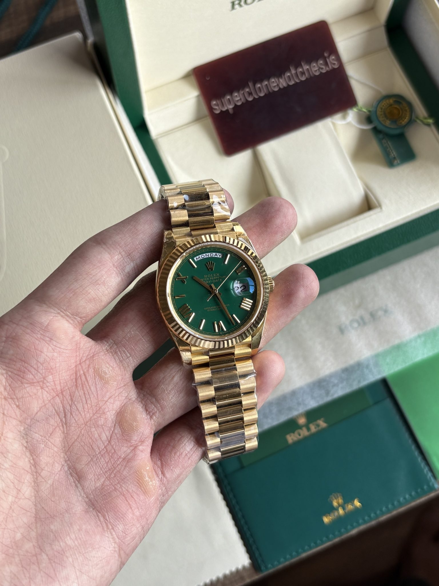 | Model | 1:1 Clone Rolex Day-Date 40mm YG Green dial Hyper Fake |