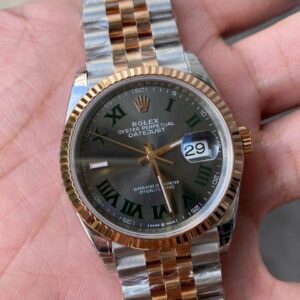 The Rolex Datejust 36 reference 126231 is a timeless expression of Rolex’s classic design, elevated with the unmistakable “Wimbledon” dial — a striking slate-grey face featuring bold Roman numerals outlined in green. This distinctive combination has become one of the most sought-after designs in the Datejust collection, celebrated for its refined elegance and sporty character.